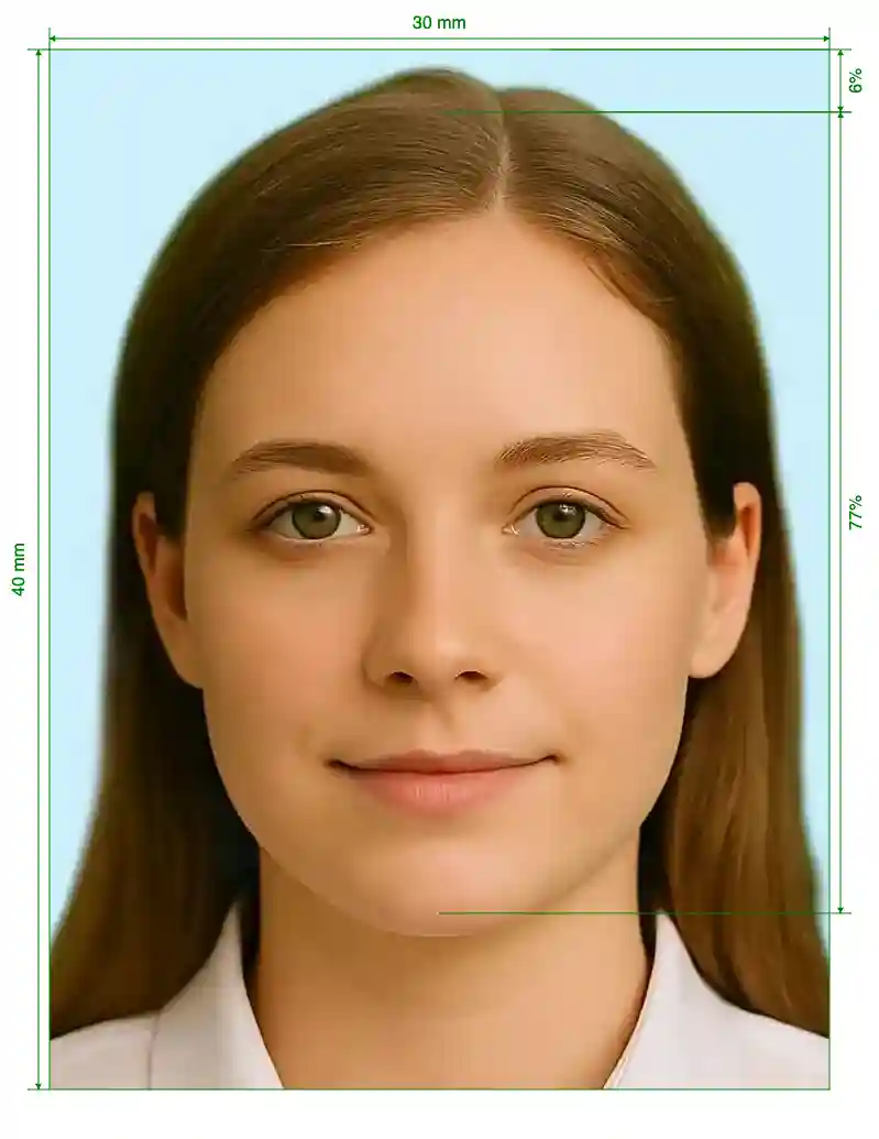 | Image Definition Parameters | Head height (up to the top of the hair): 77%; Distance from top the of the photo to the top of the hair: 6% |