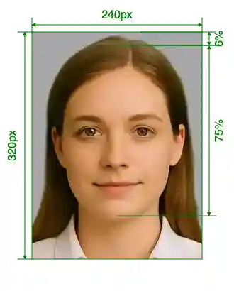 | Image Definition Parameters | Head height (up to the top of the hair): 75%; Distance from top the of the photo to the top of the hair: 6% |
