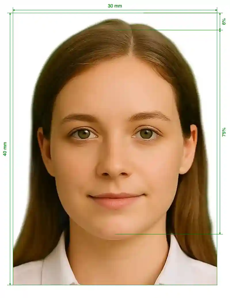 | Image Definition Parameters | Head height (up to the top of the hair): 75%; Distance from top the of the photo to the top of the hair: 6.25% |