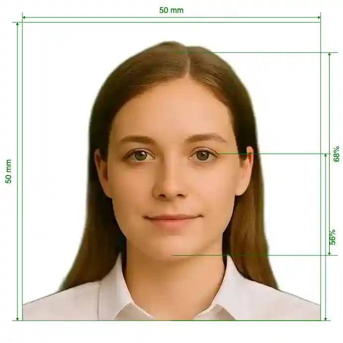 Image Definition Parameters | Head height (up to the top of the hair): 68%; Distance from the bottom of the photo to the eye line: 56% |
