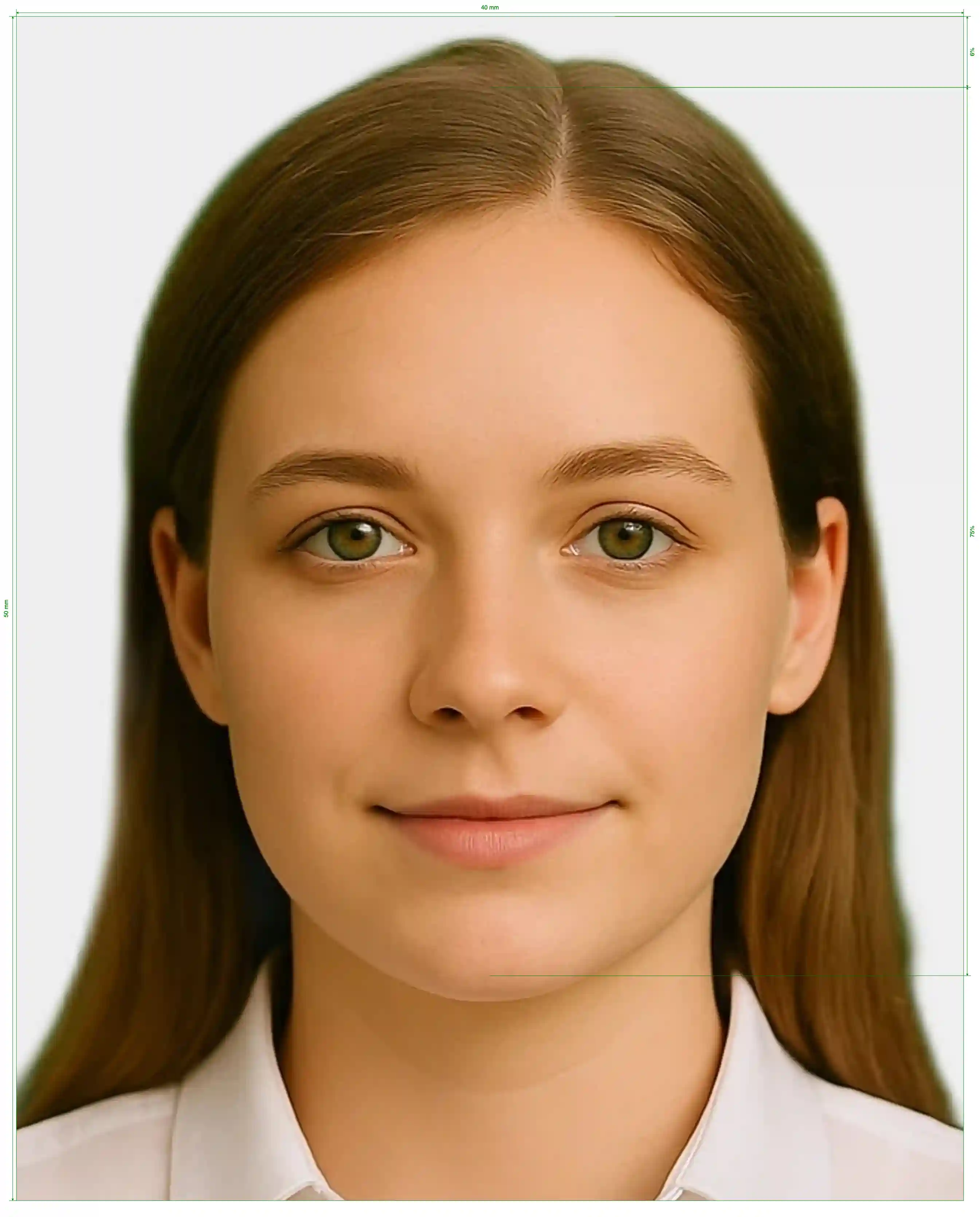 | Image Definition Parameters | Head height (up to the top of the hair): 75%; Distance from top the of the photo to the top of the hair: 6% |