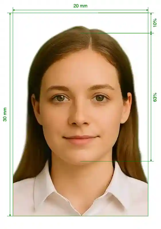 | Image Definition Parameters | Head height (up to the top of the hair): 63%; Distance from top the of the photo to the top of the hair: 10% |