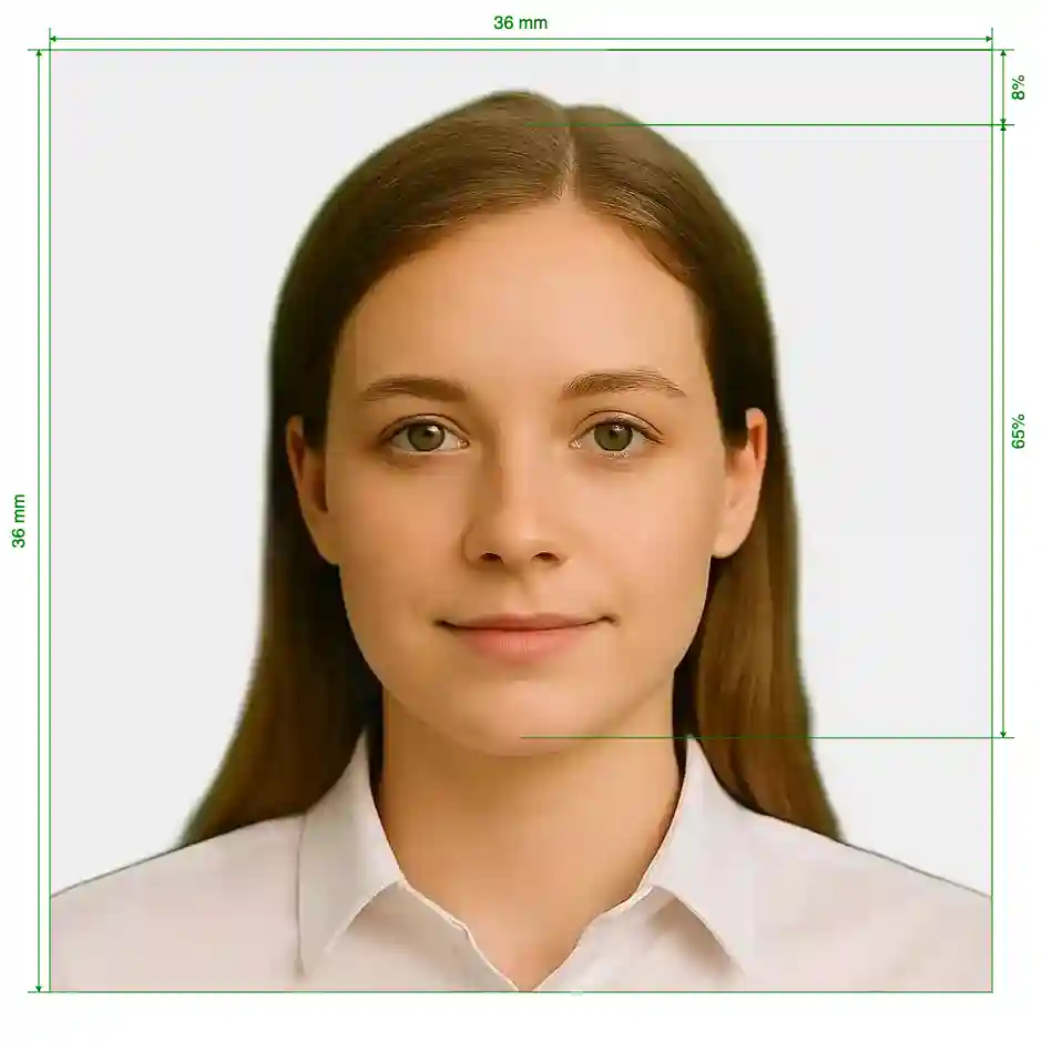 | Image Definition Parameters | Head height (up to the top of the hair): 65%; Distance from top the of the photo to the top of the hair: 8% |