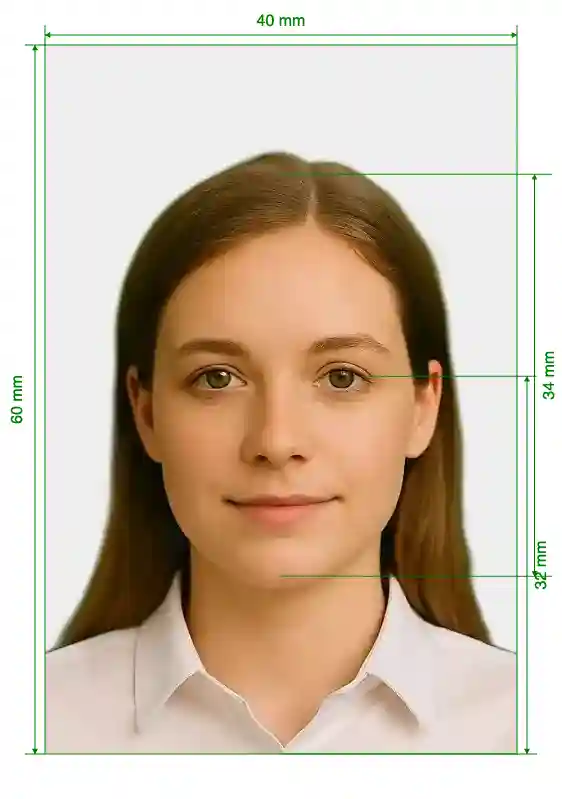 Image Definition Parameters | Head height (up to the top of the hair): 34mm; Distance from the bottom of the photo to the eye line: 32mm |