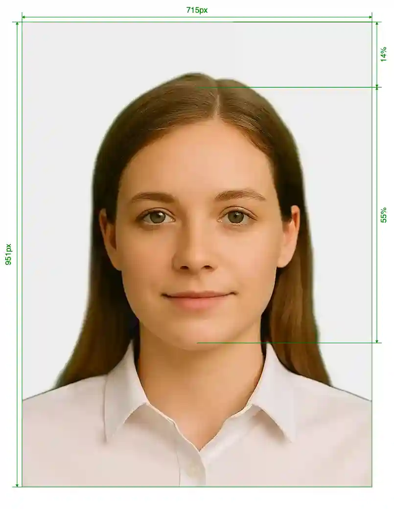 | Image Definition Parameters | Head height (up to the top of the hair): 55%; Distance from top the of the photo to the top of the hair: 14% |