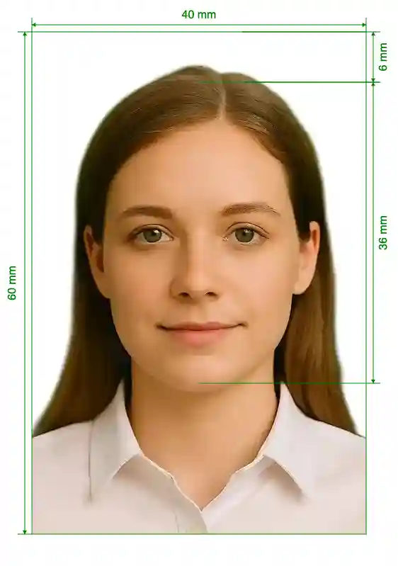 Image Definition Parameters | Head height (up to the top of the hair): 36mm; Distance from top the of the photo to the top of the hair: 6mm |