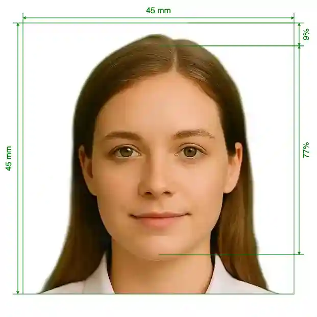 | Image Definition Parameters | Head height (up to the top of the hair): 77%; Distance from top the of the photo to the top of the hair: 8.5% |
