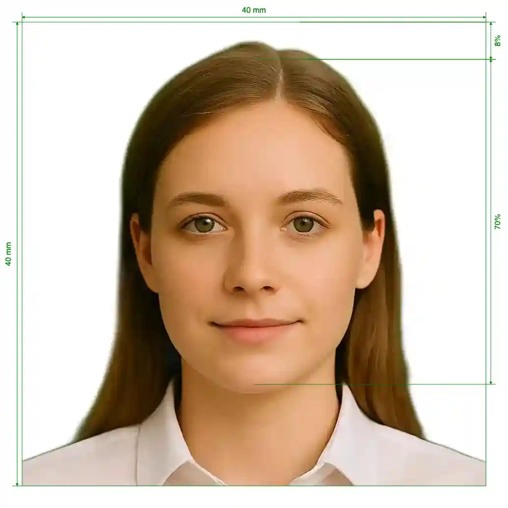 | Image Definition Parameters | Head height (up to the top of the hair): 70%; Distance from top the of the photo to the top of the hair: 8% |