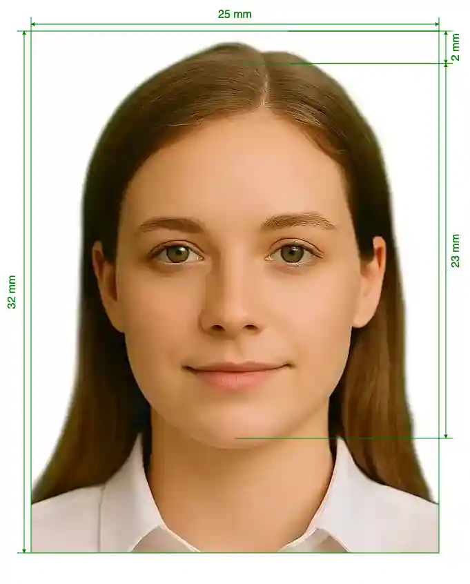 | Image Definition Parameters | Head height (up to the top of the hair): 23mm; Distance from top the of the photo to the top of the hair: 2mm |