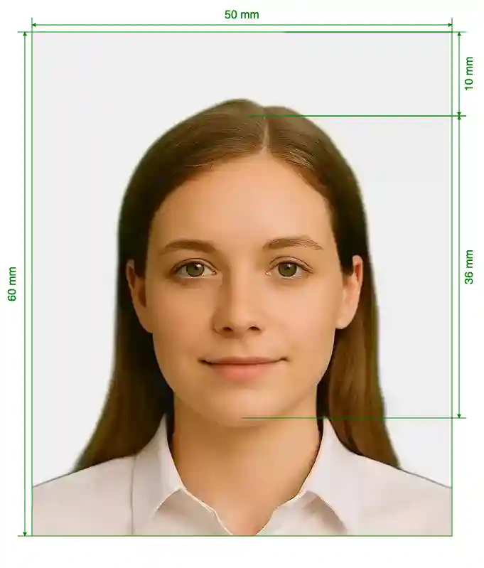 | Image Definition Parameters | Head height (up to the top of the hair): 36mm; Distance from top the of the photo to the top of the hair: 10mm |