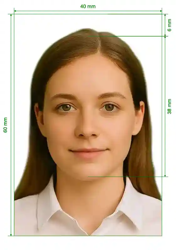 | Image Definition Parameters | Head height (up to the top of the hair): 38mm; Distance from top the of the photo to the top of the hair: 6mm |