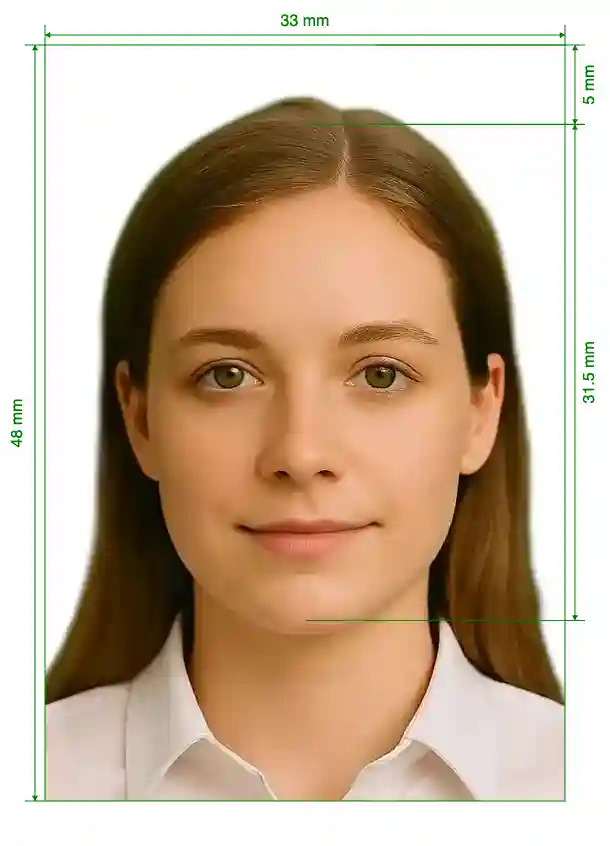 | Image Definition Parameters | Head height (up to the top of the hair): 31.5mm; Distance from top the of the photo to the top of the hair: 5mm |