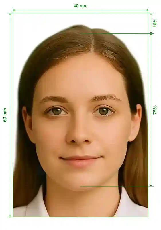 | Image Definition Parameters | Head height (up to the top of the hair): 75%; Distance from top the of the photo to the top of the hair: 10% |
