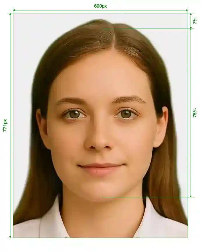 | Image Definition Parameters | Head height (up to the top of the hair): 75%; Distance from top the of the photo to the top of the hair: 7% |
